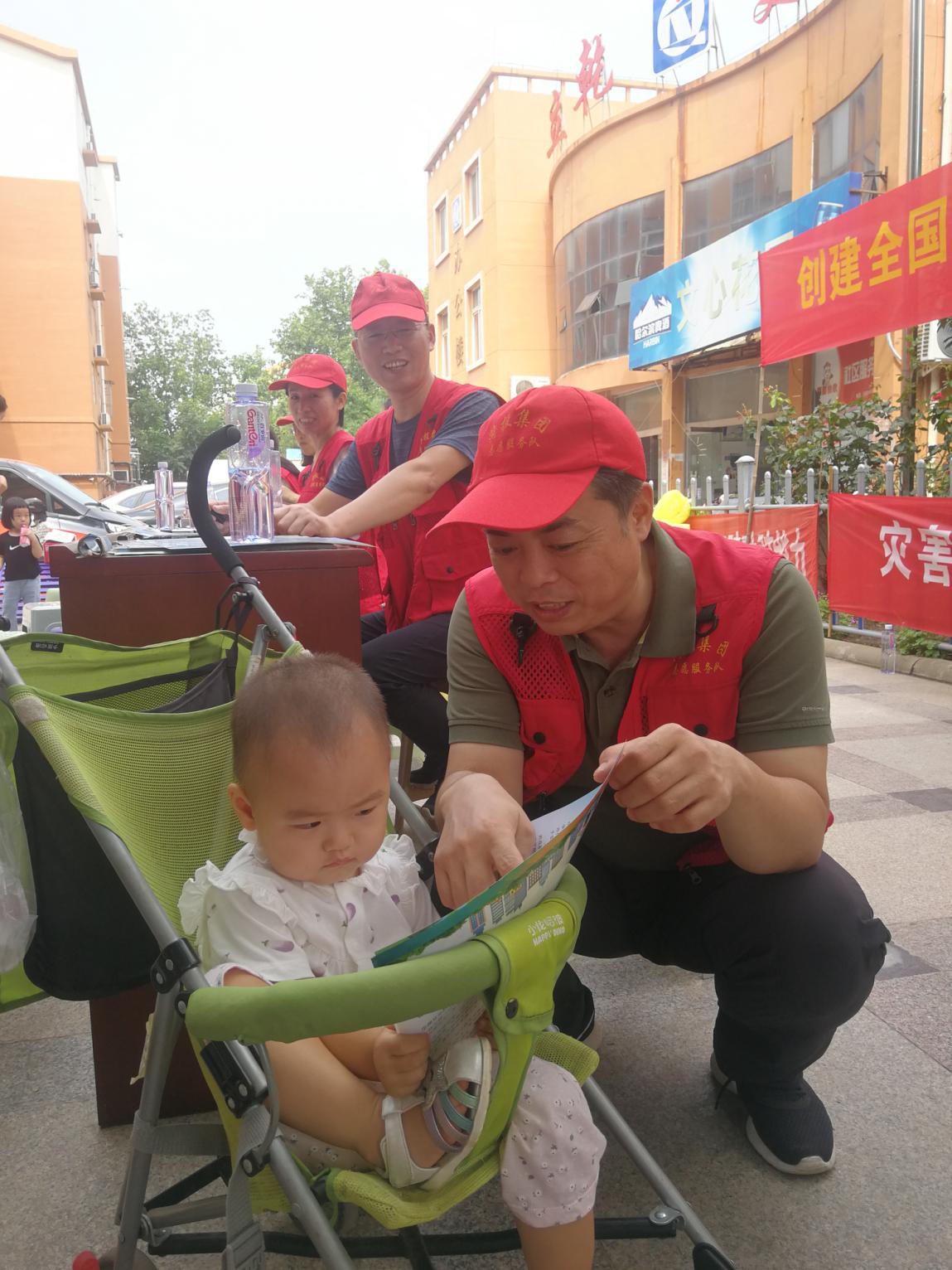 青少年在家長(zhǎng)的陪同下領(lǐng)取創(chuàng)城宣傳彩頁(yè)